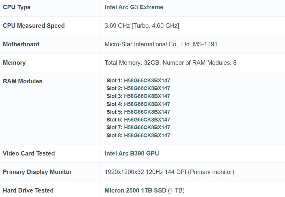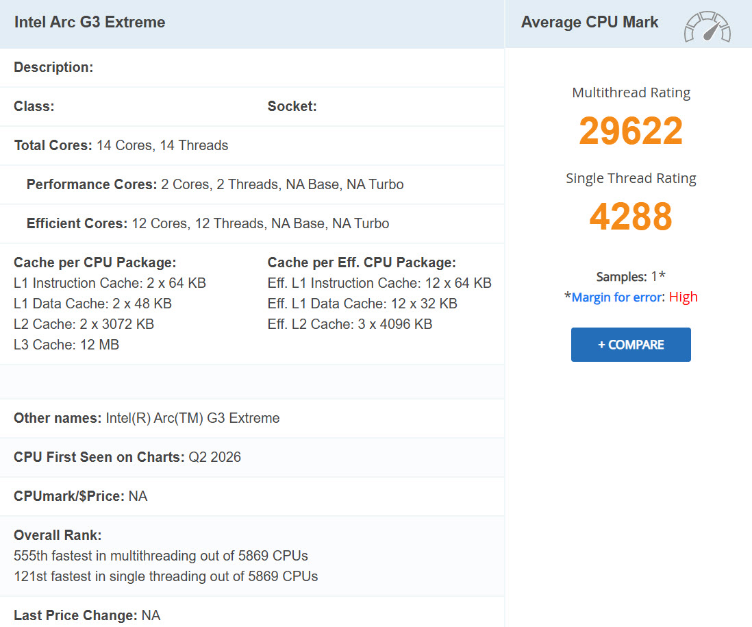 A nivel de CPU, el Arc G3 Extreme llega con 14 núcleos y 14 hilos, una configuración inédita en la línea Panther Lake. Según el listado de PassMark, solo 2 de esos núcleos son P-Cores basados en la arquitectura Panther Cove, mientras que los 12 restantes son E-Cores Darkmont, organizados en una distribución 2+8+4. El chip opera con un base clock de 3.70 GHz y un boost de 4.60 GHz, además de 12 MB de caché L3 y 18 MB de L2 en total.