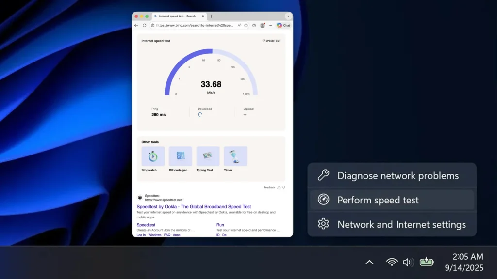 La integración permite medir velocidad de descarga y subida, latencia y jitter directamente desde la barra de tareas, ya sea haciendo clic derecho sobre el ícono de red o entrando a los ajustes rápidos de Wi-Fi o celular. Eso sí, al ejecutar el test se abre una instancia web de Bing; el beneficio real es eliminar el paso de abrir un navegador y buscar manualmente la herramienta.